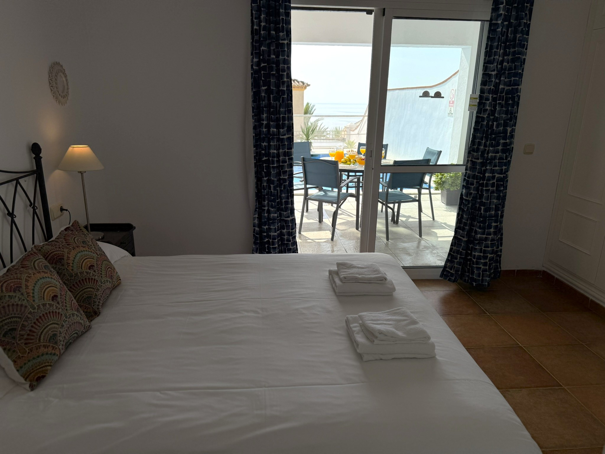 La chambre principale dispose d'un lit double et d'un accès direct à une terrasse privée avec vue sur la mer. Une chambre comprend deux lits simples placés côte à côte, tandis que la troisième chambre possède un lit double de 135 cm (petit).