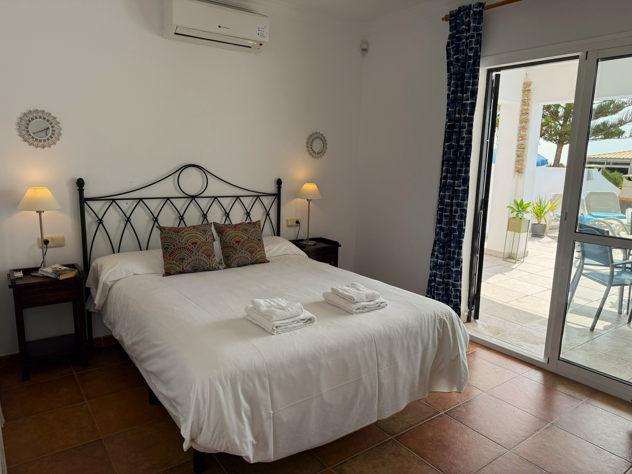 En bas du hall d'entrée, il y a trois chambres, deux lits jumeaux qui partagent une salle de bains complète et une grande chambre double Kingsize avec salle de bains attenante. Depuis la chambre double, des portes-fenêtres s'ouvrent sur la piscine et la grande terrasse.
