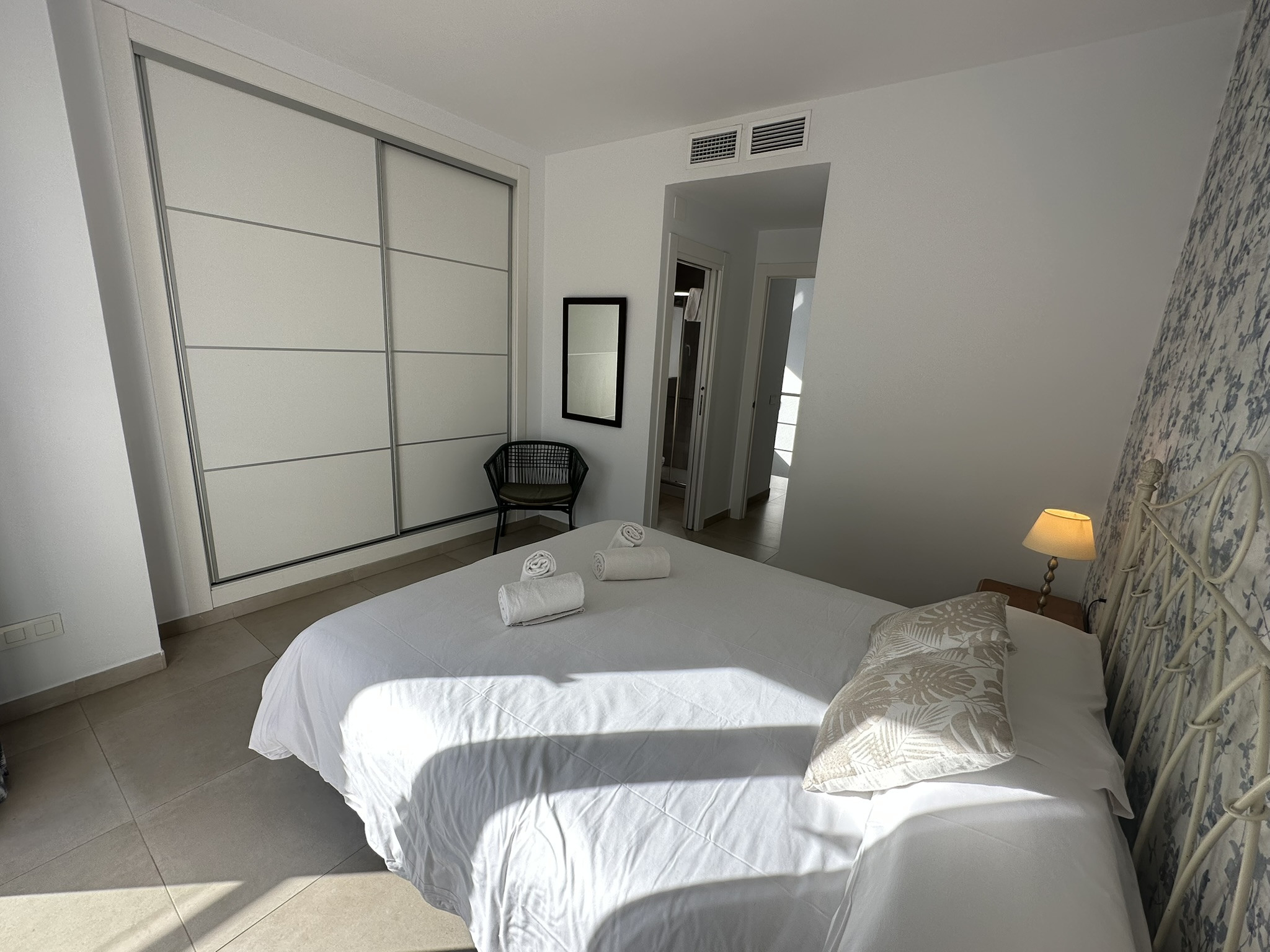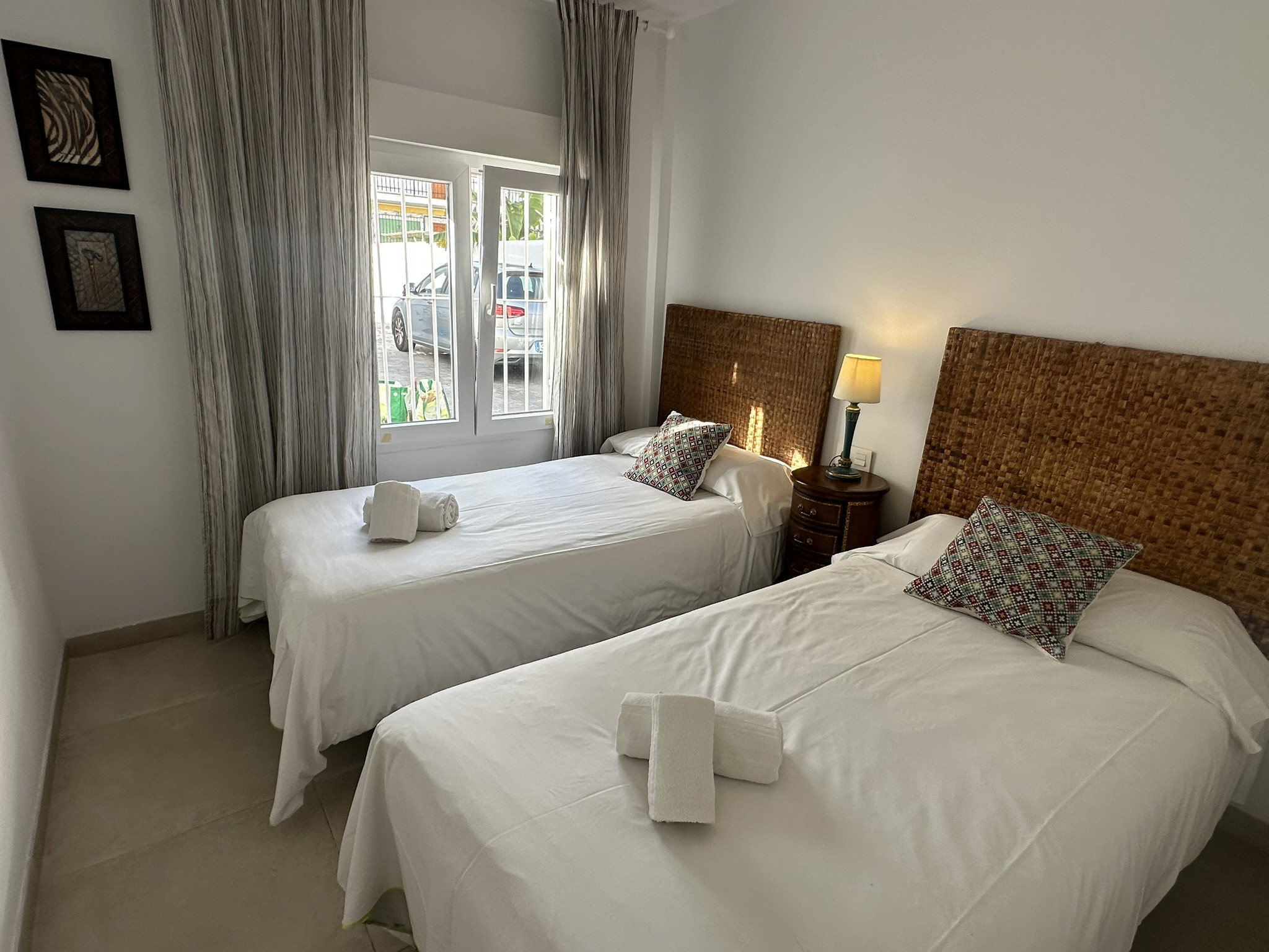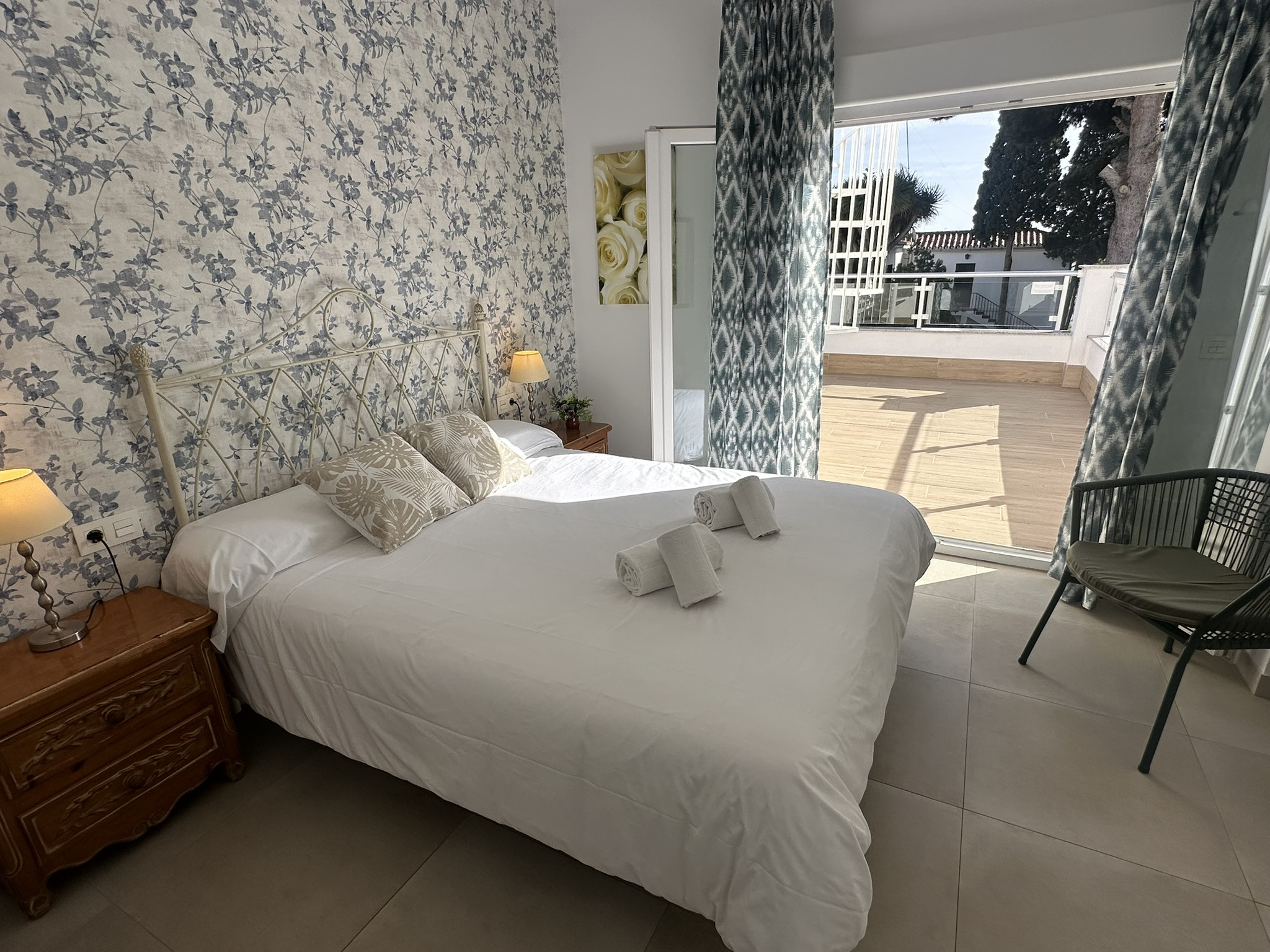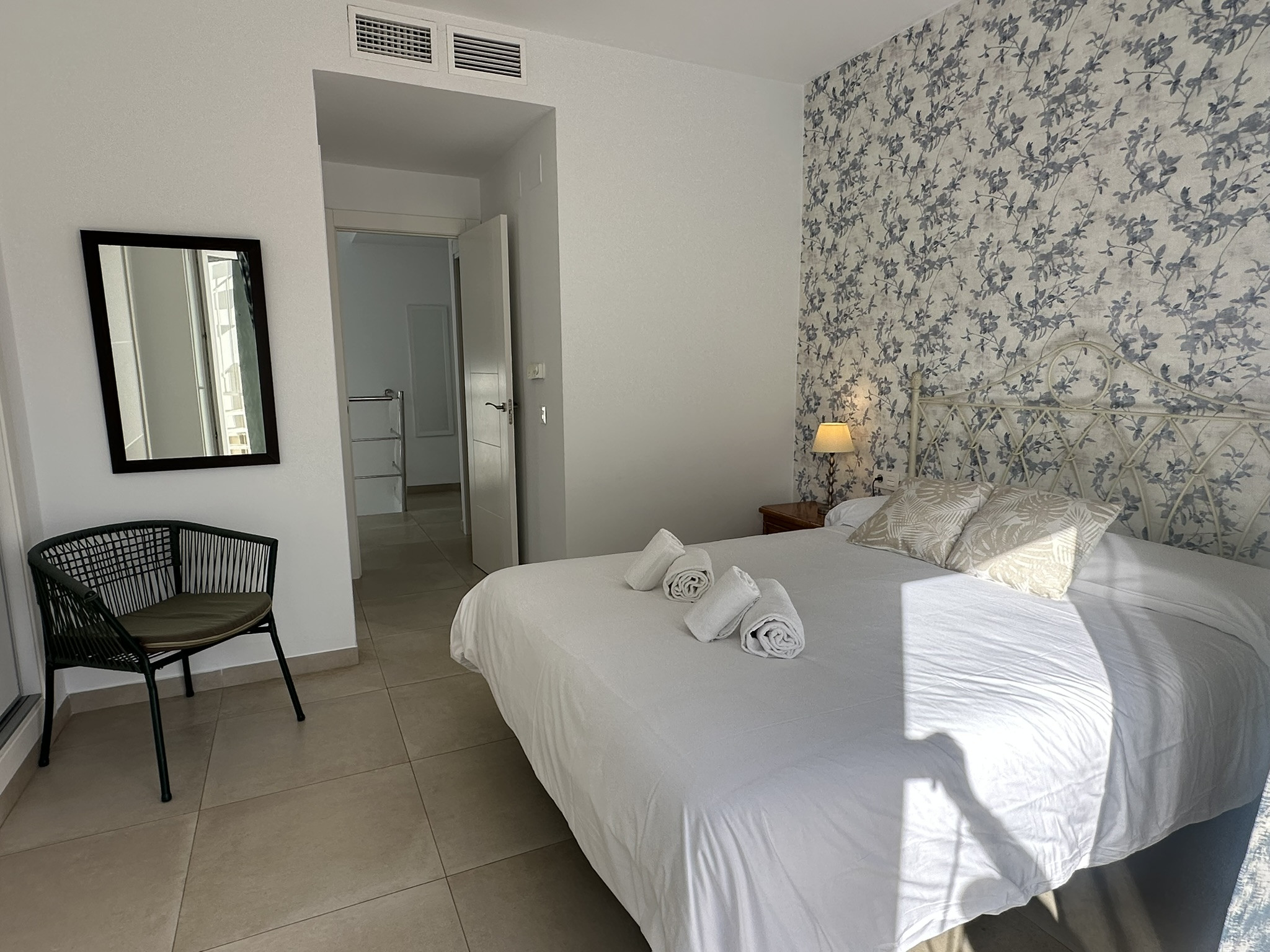 The master bedroom has a double bed and direct access to a private terrace with sea views. One bedroom features two single beds placed together, while the third bedroom has a 135 cm (small) double bed.