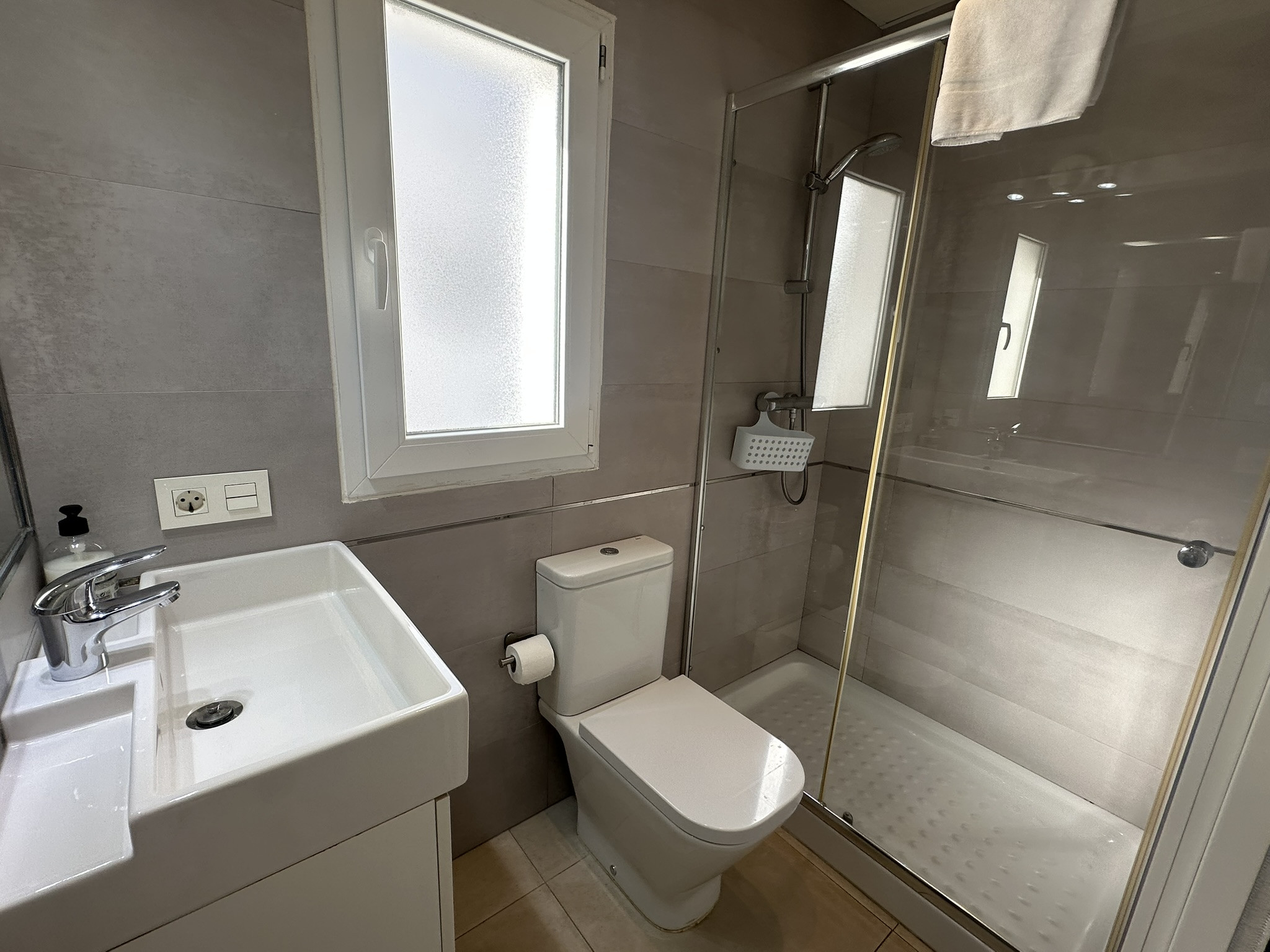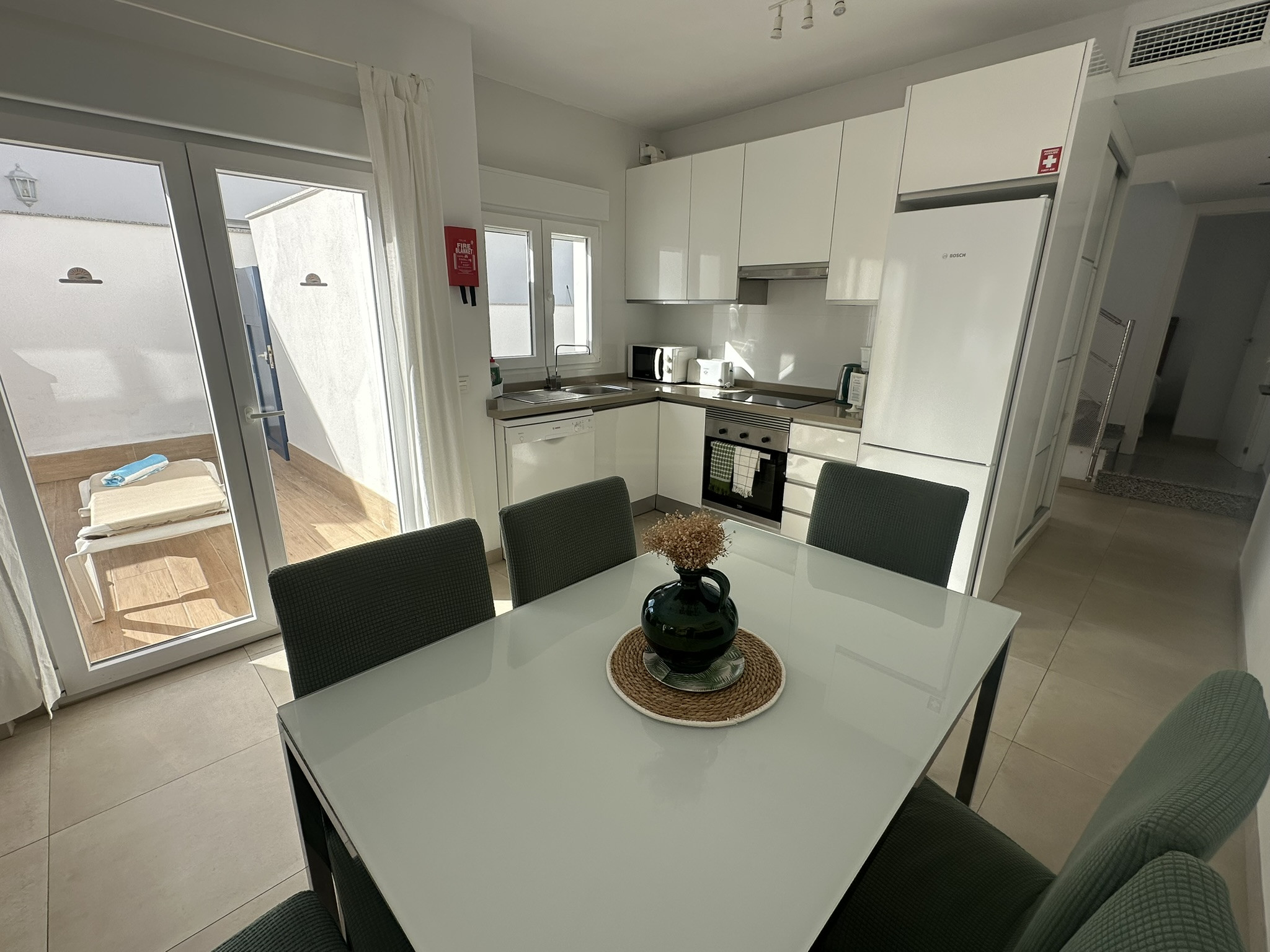 Upon entering from the street, you are welcomed into a cosy open-plan living and dining area, elegantly decorated in a Mediterranean style. Large windows and glass doors allow natural light to flood the space and provide direct access to the terrace, creating a seamless connection between the indoors and outdoors.